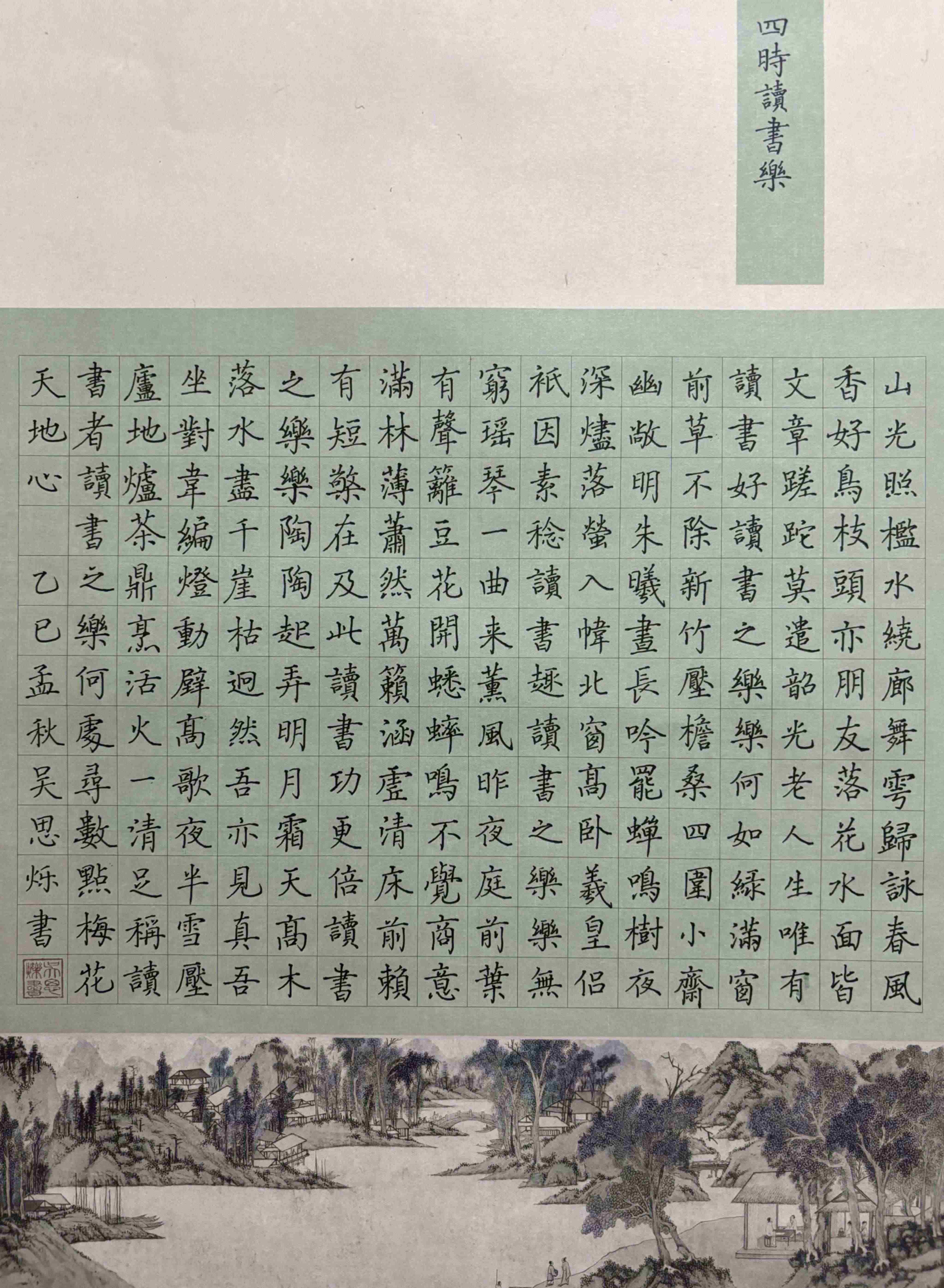 这幅楷书《四时读书乐》以笔墨为桥,将读书之趣与自然之美娓娓道来。作品里,“山光照槛水绕廊”的春景、“绿树阴浓夏日长”的夏意,还有“落叶敲窗风渐紧”的秋韵、“雪压檐低玉尘飞”的冬趣,都成了读书时的背景。文字间满是对阅读的热爱——从捧书时的欣然,到沉浸中的忘忧,把“书卷多情似故人”的心境写得真切。笔墨工整间藏着温润,让我们透过字里行间,想起灯下读书的宁静,也更懂为何古人总说“读书之乐乐无穷”。