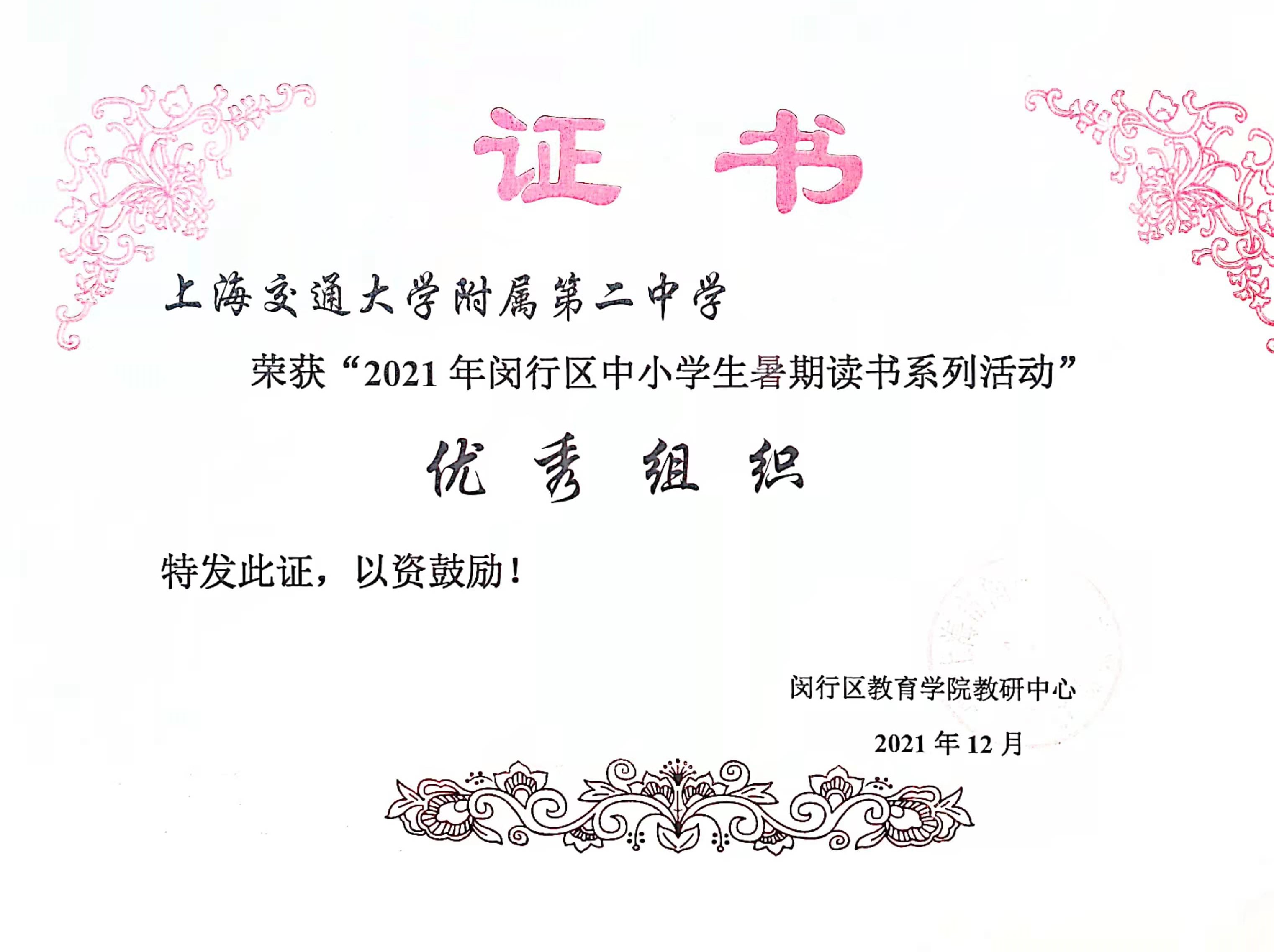 2021年暑期,我校组织学生积极参加了由上海市教育委员会中小学图书馆工作委员会联合上海市教育委员会教育技术装备中心等单位组织开展的“2021年上海市中小学生暑期读书活动”。通过学习、思考、实践及反复的修改,最终上传80多幅作品。初一8班胡舒然同学获市二等奖,我校姚郁会老师获优秀组织奖。
