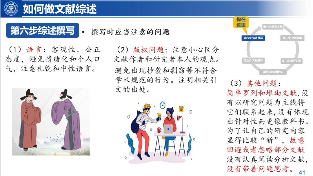 一定要有批判性思维 前人哪里对的?哪里不对的?不对的理由?你会怎么完善?不同作者观点有什么不一样?为什么会不一样?前人研究的内容和自己研究的内容有什么联系?自己研究的问题新异、特点和价值在哪?